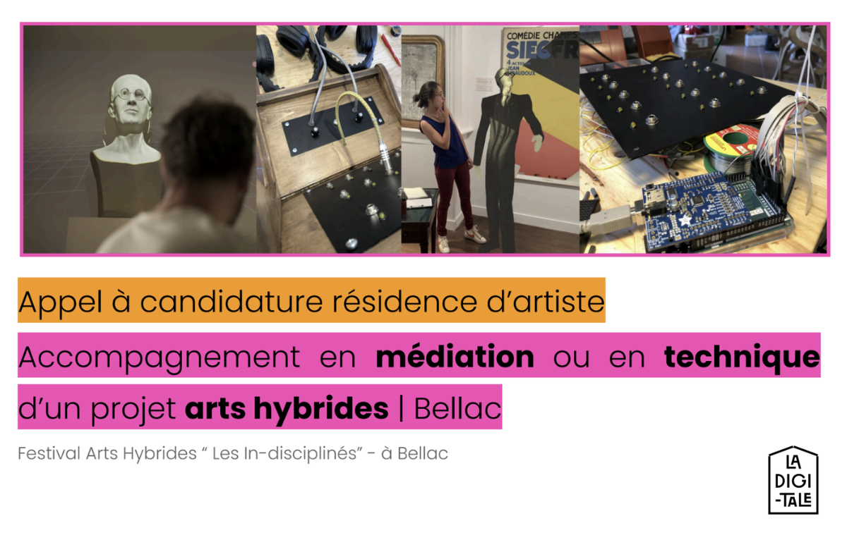 Nous souhaitons valoriser et partager avec le public de Bellac et environnant, le champ artistique des écritures plurielles (artistiques et numériques) en proposant des ateliers, des performances et des installations. Ainsi, avec cet appel à Candidature, La Digitale souhaite accompagner deux projets dans le domaine des arts hybrides, pour lesquels le besoin de développement d’un volet médiation ou de conception technique est un enjeu dans leur processus de création.