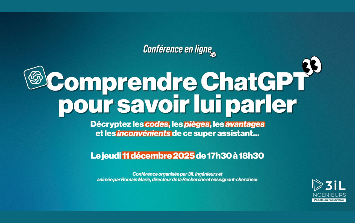 Vous êtes curieux d’explorer le fonctionnement de ChatGPT et de découvrir comment en tirer le meilleur parti ? Rejoignez nous le jeudi 11 décembre 2025, de 17h30 à 18h30, pour une web conférence animée par Romain MARIE, enseignant-chercheur et directeur de la recherche à 3iL Ingénieurs