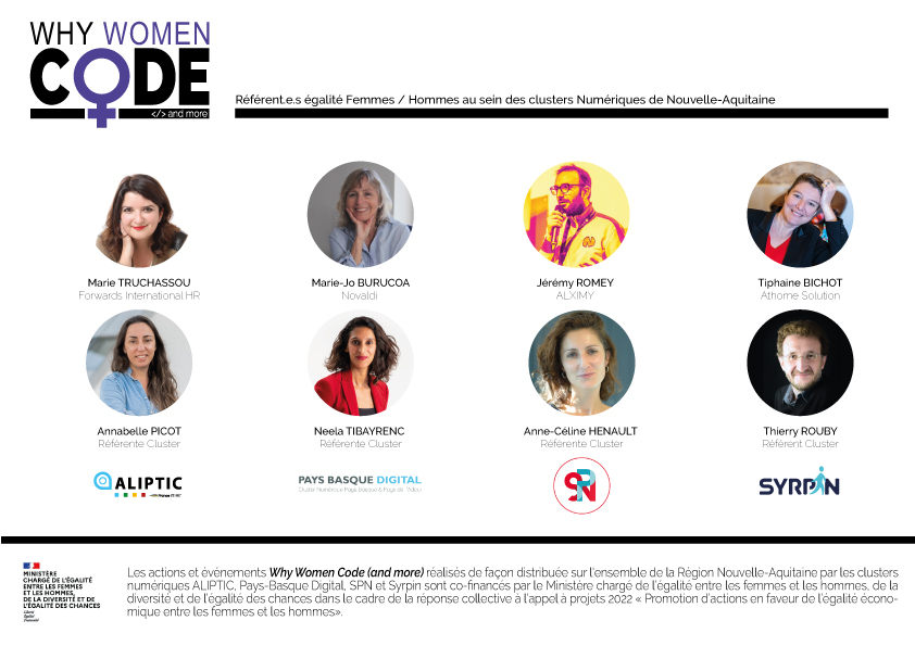 Partant du constat qu'en Nouvelle-Aquitaine, sur les 37000 professionnels que comptent les métiers du numérique, on dénombre seulement 23% de femmes (d’après l’étude 2021 de l’observatoire régional de l’égalité professionnelle femmes-hommes portée par Cap Métiers Nouvelle-Aquitaine), que le taux de femmes qualifiées dans notre secteur est inférieur à celui des hommes et que le nombre de femmes présentes dans les filières de formations de nos métiers est exceptionnellement bas (nos partenaires écoles et universités nous indiquent que seulement 10 à 15% des promotions sont des femmes), il est pertinent et urgent d'agir en ce domaine. C'est en s'appuyant sur un écosystème dense et structuré, accoutumé au travail en coordination à l'échelle régionale depuis plusieurs années (au travers notamment de dispositifs ARFSN-ADEC, d'actions de promotion de l'apprentissage, de feuilles de routes communes et partagées), que les clusters numériques ALIPTIC, PAYS BASQUE DIGITAL, SPN et SYRPIN ont développé une marque régionale dédiée, Why Women Code (and more), qui couvre un ensemble d'actions répondant à l'enjeu du renforcement de l'égalité femmes/hommes dans la filière.